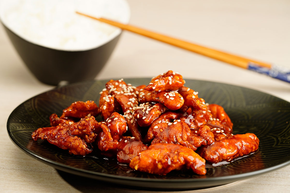 Cortes de Pechuga de Pollo rebozada con salsa de Miel y Ajonjolí + Arroz Blanco